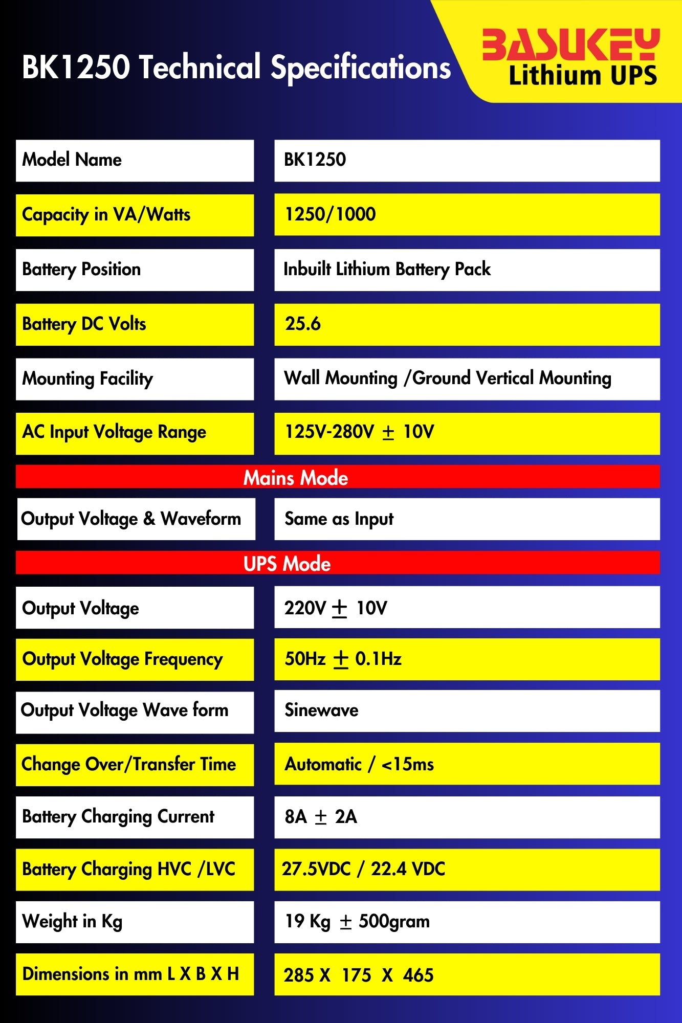 Download the BK1250 Catalogue WEF-10.10.2024 Click here The Basukey Lithium UPS BK1250 1250Va is a high-quality backup power solution designed to provide reliable and efficient power to your devices and appliances. With a capacity of 1.25Kva/1000W, this UPS can support small to medium-sized loads and provide uninterrupted power in the event of a power outage or voltage fluctuations. One of the standout features of the Basukey Lithium UPS is its use of lithium-ion batteries, which offer several advantages over traditional lead-acid batteries. Lithium-ion batteries are lighter, more compact, and have a longer lifespan, making them an excellent choice for backup power systems. Additionally, the Basukey Lithium UPS features advanced battery management technology to optimize battery performance and extend its lifespan even further.Download the BK1250 Recent Installations WEF- 10.10.2024 Click Here Download the Basukey Lithium UPS 12 Page catalogue-1.10.2024 Click Here The Basukey Lithium UPS BK1250, 1250Va also features a built-in automatic voltage regulator (AVR) to protect your devices from voltage fluctuations and surges, ensuring a stable and reliable power supply. The UPS also includes a built-in LCD to provide real-time information on system status, battery levels, and other important metrics. With its compact design, reliable performance, and advanced battery technology, the Basukey Lithium UPS BK1250 1.25Kva is the perfect choice for protecting your valuable devices and appliances from power outages and other power-related issues.